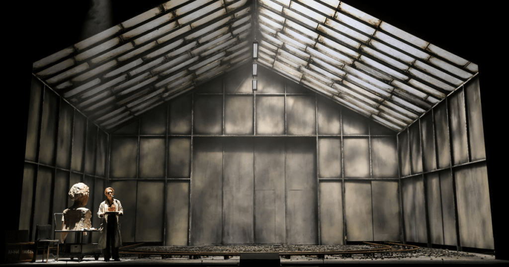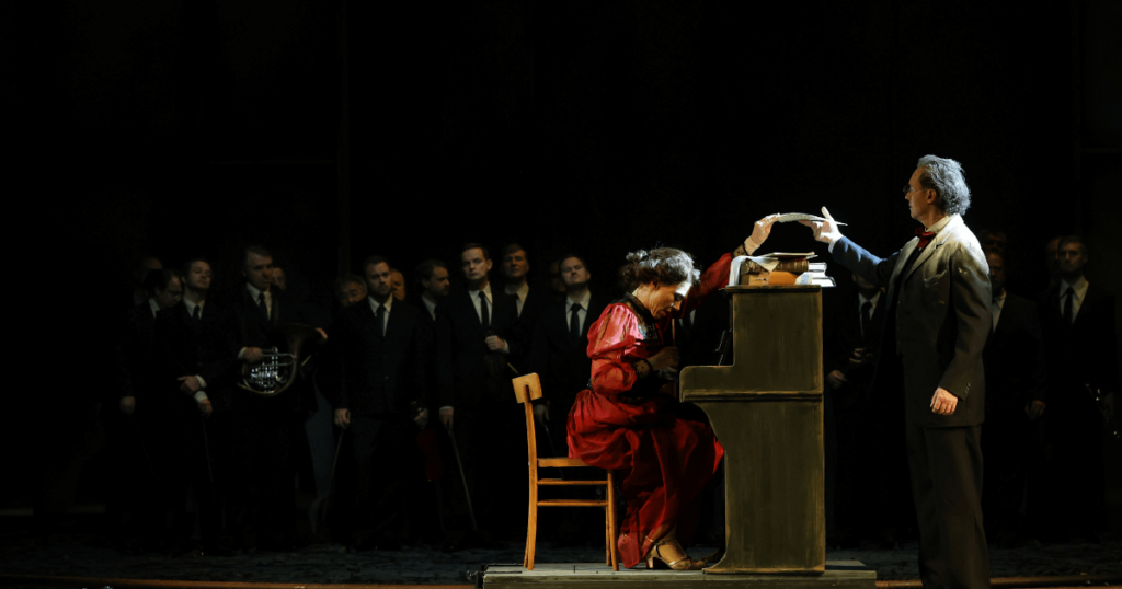 Die Oper spielt in einem Bühnenraum, der wie eine alte Remise wirkt, mal dunkel und düster, mal strahlend beleuchtet, Projektionen sorgen für extra Dramatik. Auf einer Schiene rollt ein Konzertflügel rein und raus, immer dann, wenn die Emotionen hochkochen. Dazwischen kommen Almas verstorbene Kinder in einem Wagen auf die Bühne –  Gänsehaut-Momente garantiert.