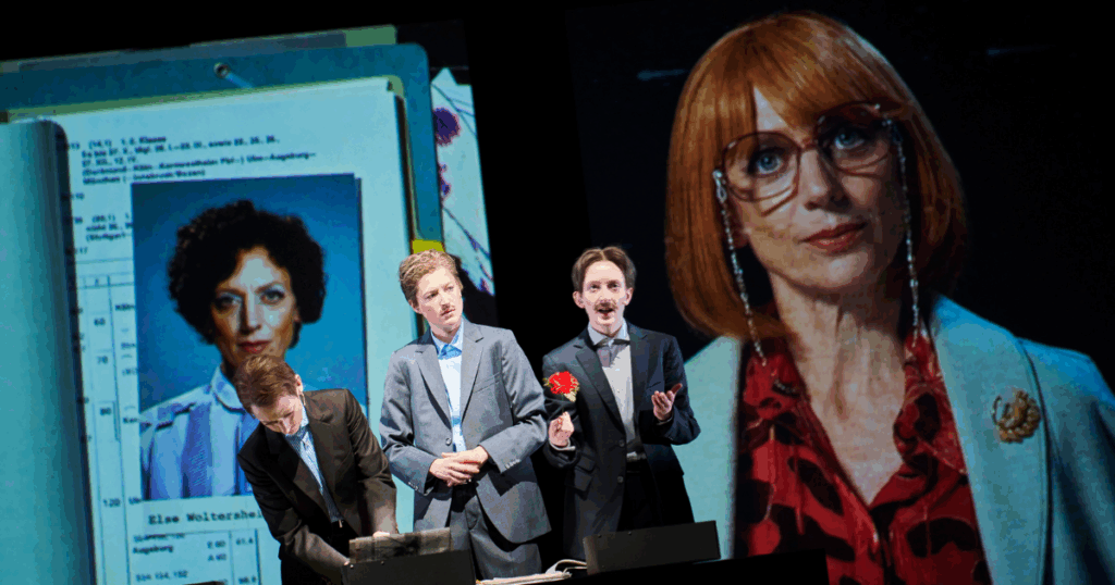 Wenn sie nicht gerade lipsyncen, wühlen sich die Schauspielerinnen zum Beispiel als Männer in Anzügen durch Akten sowie Protokolle und rollen den Fall fürs Publikum nochmal auf. Wir sehen die Cover des fiktiven Boulevardmagazins “die ZEITUNG” und die Schlagzeilen, die über Katharina gedruckt werden. Videos zeigen, wie sie sich im Verhör für jedes Detail ihres Lebens rechtfertigen muss: