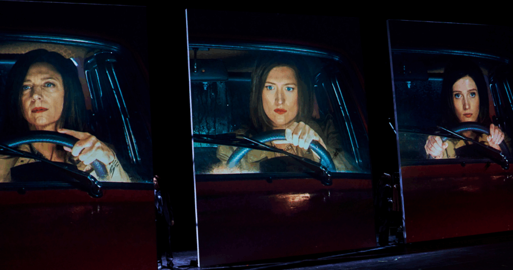 Man weiß gar nicht, worauf man sich konzentrieren soll: Auf Katharina Schmalenberg, Lola Klamroth und Rebecca Lindauer, die im Burgtheater auf der Bühne stehen? Oder auf die riesigen Videoeinspielungen hinter ihnen, auf denen die drei Schauspielerinnen überlebensgroß in immer wechselnden Rollen zu sehen sind?