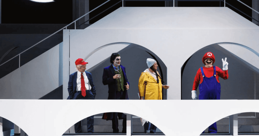 In Nina Spijkers’ Inszenierung der Strauss-Operette “Eine Nacht in Venedig” an der Volksoper Wien treffen Operetten-Tradition und moderne Popkultur aufeinander. Zwischen politischen Anspielungen, Superheldenkostümen und menschengroßen Fischen entsteht ein buntes Chaos aus Täuschung, Lust und Party.