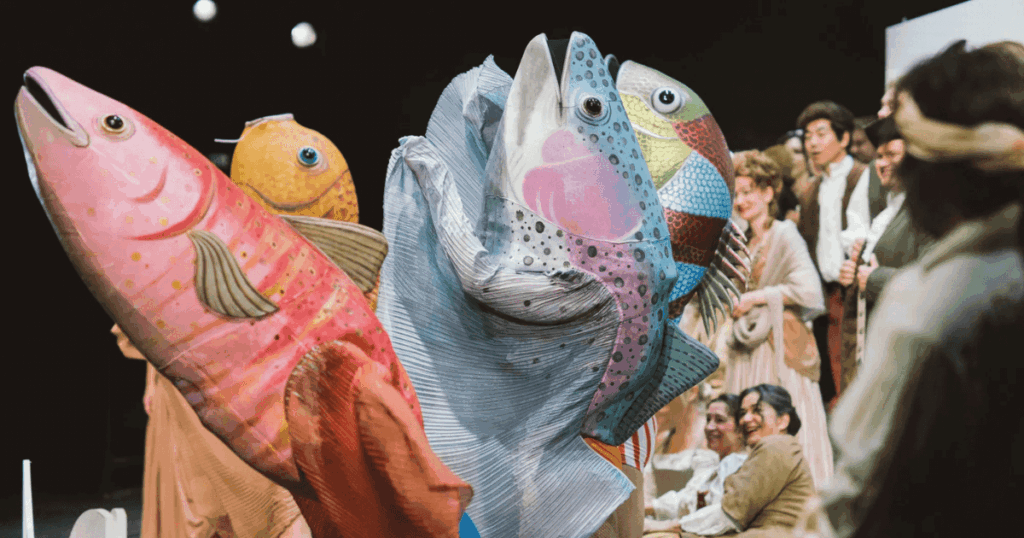 Mittendrin: Annina (Johanna Arrouas), Fischerin und zugleich Barbaras Freundin. Sie ist die eigentliche Heldin dieses ersten Akts – frech, klug und mit einer Stimme, die sofort fesselt. Eine klassische Version ist es definitiv nicht, auch wenn anfangs die barocken Kleider da sind. Als Annina ihre Arie “Frutti di mare” singt, umgeben von menschengroßen Fischen, ist das nämlich irgendwo zwischen surrealem Traum und ironischem Bühnenwitz. Schon hier wird klar: In dieser Nacht in Venedig verschwimmen die Grenzen.