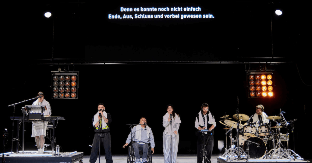Revue-Line-up: Barbara Morgenstern, Hana Hazem Arabi, Adham Elsaid, Michaela Groch-Fischer, Peter Breitenbach, Daniel Eichholz © Marcel Urlaub, Volkstheater