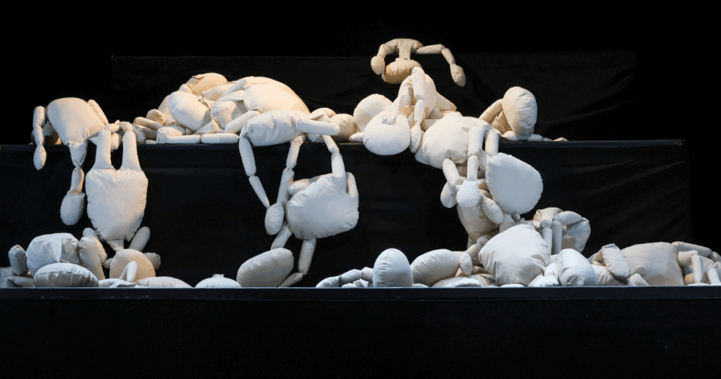 Povo und Reitter bewegen die eigentlich leblosen, weiß gehaltenen Puppen, in voller Sichtbarkeit mit den Händen und Füßen. Eigentlich komisch, dass man so in die Handlung hinein kippt – irgendwie gelingt es den beiden allerdings doch, das Publikum in die Welt der Diktatoren hineinzuziehen. Es ist die Reibung zwischen kindlicher Plakativität und künstlerischer Präzision, die schlichtweg eine seltsam fesselnde Atmosphäre schafft.