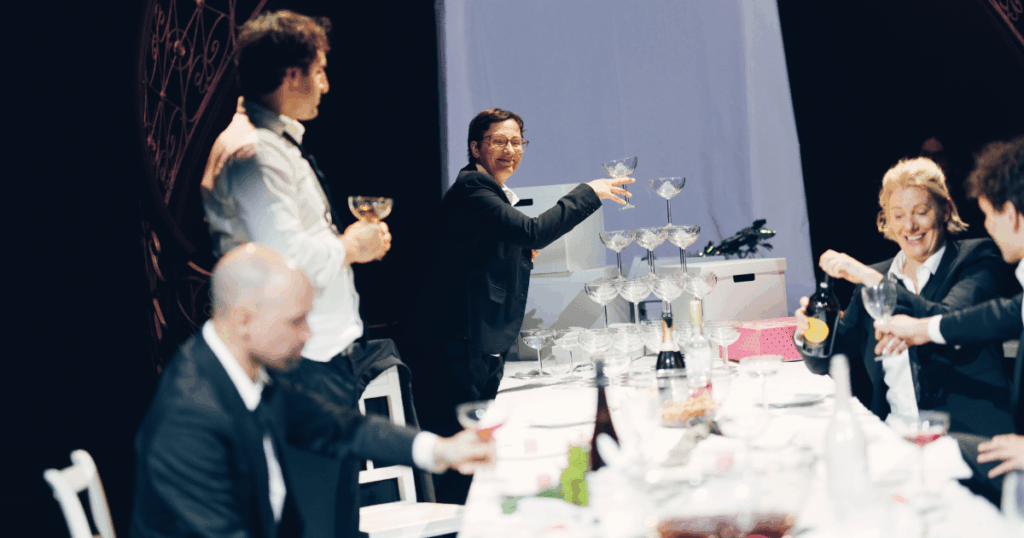 Ein großer Tisch mit Sektpyramide, Kuchen und Geschenken: alles da. Das Bühnenbild bleibt gleich, nur die Anlässe wechseln. Von großen Umbrüchen wie einer Geburt oder dem Sturz des iranischen Regimes bis zur wöchentlichen Feier über eine neue Tatort-Folge (sorry, „blutige Täter“-Folge, wie die Serie im Stück heißt). Sogar die tägliche Ekstase eines Hundes über die heiß ersehnte Rückkehr des Herrchens ist Anlass genug. Zelebriert werden „gelungene Feiern und jene, die nichts wurden“, wie es im Stück heißt.
