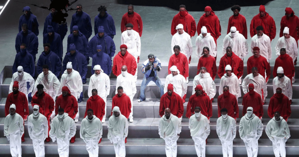 Kendrick Lamar ist bekannt für seine Kritik am Justiz- und Politischen System der USA. Auch die Choreografien der Tänzer*Innen, die Bühne sowie die Outfits spiegeln diese Kritik wider.
