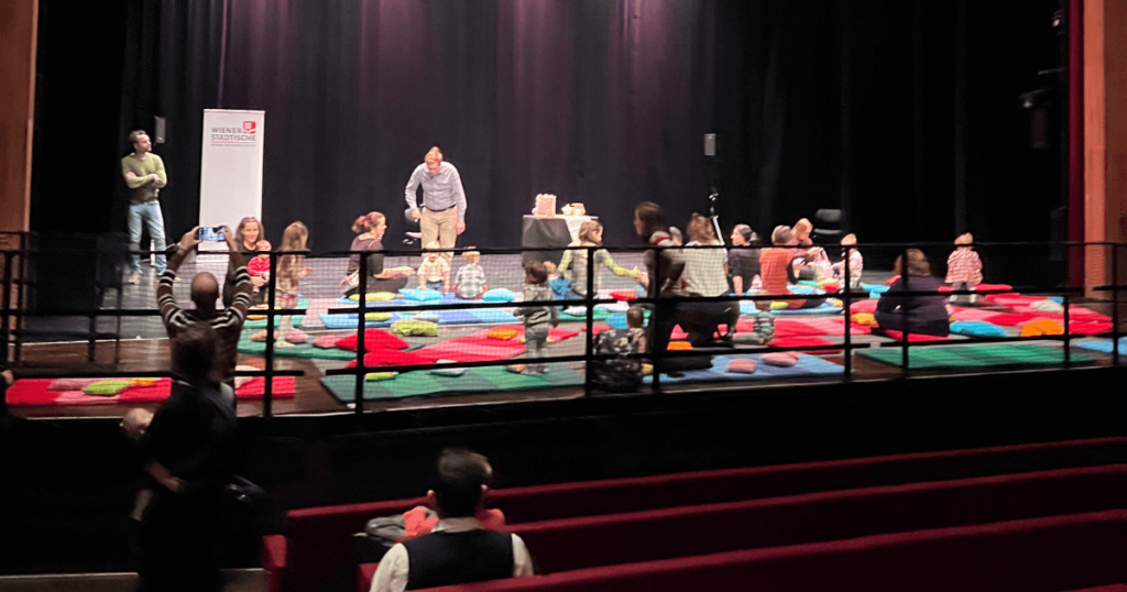 Laut Muth laden sie “die jüngsten Entdeckerinnen und Entdecker zum Krabbeln, Brabbeln, Lachen, Lauschen, Singen, Spielen und Tanzen ein”. Um diesem Entdeckerdrang nachgehen zu können, benötigen das Kind und die Begleitperson ein Bühnenticket. So hat man die Möglichkeit auf bunten Pölstern und Matratzen das Geschehen frontal auf der Bühne zu erleben. Nachdem eine Zielgruppe von Kindern zwischen 0 und 3 Jahre angepeilt ist, kann man davon ausgehen, dass viele dynamische kleine Kinder auf der Bühne herumwuseln und alles andere als Sitzen werden. Zudem gibt es Tickets für den Zuschauerraum, welche man jedoch nur jenen zumuten kann, die von Kinderliedern und Kindergeschrei akustisch profitieren. Wie sinnvoll das ist sei in Frage gestellt (eher nach dem Motto dabei sein ist alles?).