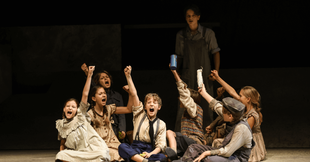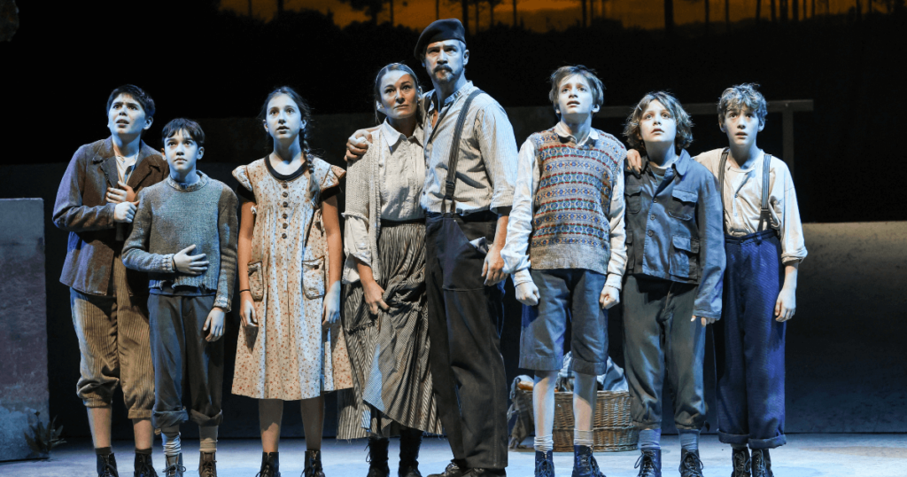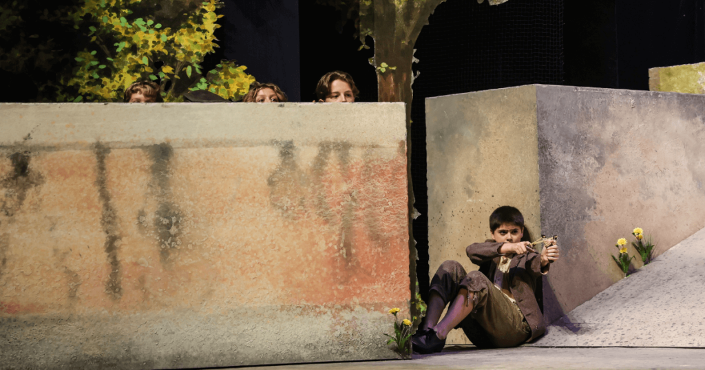 Umso besser ist es, dass schon beim Betreten des Saales großes Staunen ausbricht. Denn die Bühne sieht aus wie ein Portal in ein französisches Dorf. Der Orchestergraben ist geschlossen und überdacht, eine Loge wurde in ein Baumhaus verwandelt. Auf der Leinwand im Hintergrund werden durch wandernde Sonne und Mond Tag und Nacht unterscheidbar – und auch, wie viele Tage während des Stücks vergehen. Die Musik wird von einer kleinen Gruppe von Musikant*Innen geliefert – Gitarre, Schlagzeug, Violine, Akkordeon – und ist absolut ausreichend. Gesprochen wird auf deutsch, gesungen auf deutsch und französisch, Übertitel gibt es keine. Die braucht es aber auch nicht. Erstens würden sie die Zuschauer*innen, vor allem die Kinder, bei diesem Stück nur ablenken. Zweitens sind die Stimmen dank Mikrofonen verstärkt und das gesamte Ensemble spricht und singt extrem deutlich und verständlich.