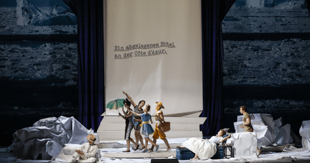 Die Vorstellung von “La Rondine” zeigt nicht nur eine breite Auswahl aus recycelten Bühnenobjekten, sondern ebenso eine Mischung aus einigen Puccini-Opern. Passt gut, denn schicksalhafte Frauenrollen ziehen sich gern durch Puccinis gesamtes Opernwerk und machen auch vor La Rondine keinen Halt. Man sieht Magda in dieser Inszenierung vieles machen, was man vielleicht schon woanders gesehen hat: Den tödlichen Sprung Toscas von der Engelsburg (aus der Oper Tosca), die liegende Haltung der sterbenden Mimi (La Bohème) und den imitierten Messerstich Madame Butterflys (Madama Butterfly). Doch eines bleibt letztendlich nur Magda vorbehalten: ihr eigenes, selbstgeschriebenes Ende. Plot Twist: Sie darf leben!