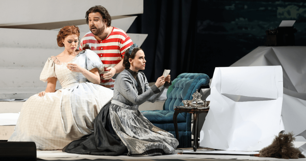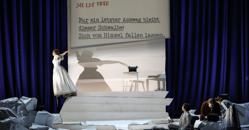 Der Bühnenvorhang hebt sich und mitten im Bühnenbild hängt eine überdimensional große Schriftrolle.. Da die Originalsprache des Librettos Italienisch ist, werden auf dieser Schriftrolle zeitgleich zum Gesang der Darsteller:innen die gesungenen Textstellen in den Sprachen Deutsch und Englisch übertragen. Dass diese Textübertragung auf der riesigen Schriftrolle nicht nur dem Verständnis dient, zeigt sich allerspätestens, als Lisette beginnt, ihre Geschichte selbst zu schreiben. Während sie versucht, Prunier von der Schreibmaschine zu zerren, färbt sich der Bühnenraum in warmem, rotem Licht und ihre krakelige Schrift erscheint auf der Papierrolle. Aber sobald Pruniers ordentliche Schrift wieder die Oberhand gewinnt, schwingt auch das Licht wieder in kalte Blautöne um. Dieses Lichtspiel macht es trotz aufbauschender Handlung sehr einfach, dem Spektakel zu folgen. Bei jedem von Lisettes Versuchen, die Schreibfeder zu übernehmen, fiebert man einfach mit.