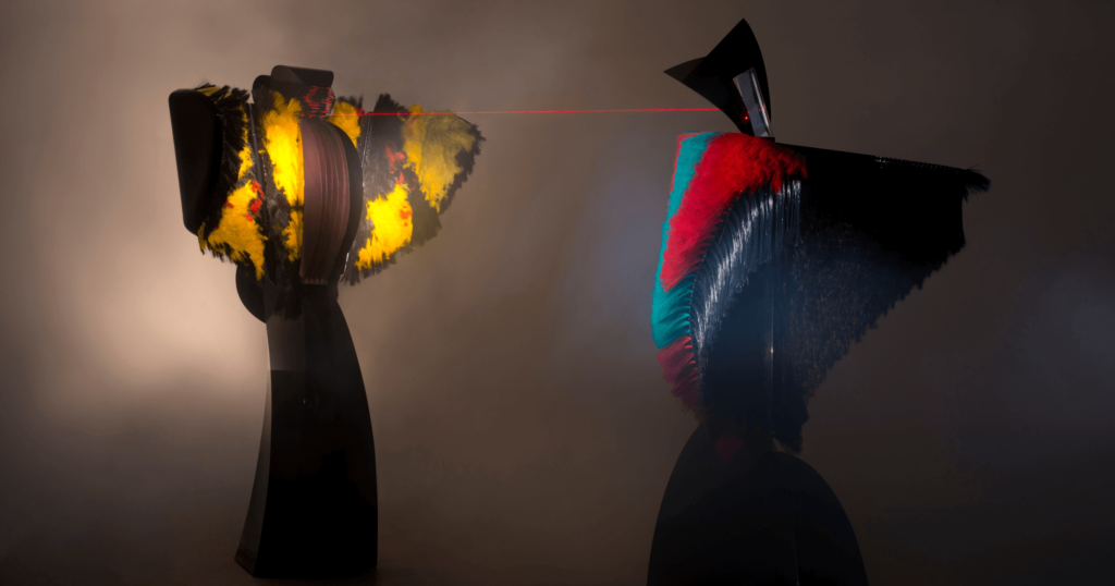 Mein Highlight der Ausstellung ist der separate Raum, in dem Lijns Cosmic Drama präsentiert wird. In der Dunkelheit begegnen sich dort zwei eindrucksvolle Skulpturen: Lady of the Wild Things (1983) und Woman of War (1986). Diese treten in einen spannungsgeladenen Dialog miteinander. Die Lady of the Wild Things, eine frühe Schutzgöttin der Natur, reagiert mit Lichtsignalen auf die Warnungen der kriegerischen Woman of War. Begleitet wird diese Interaktion von Lijns eigener Stimme, die in eindringlichem, wütendem Gesang die Menschheit warnt.