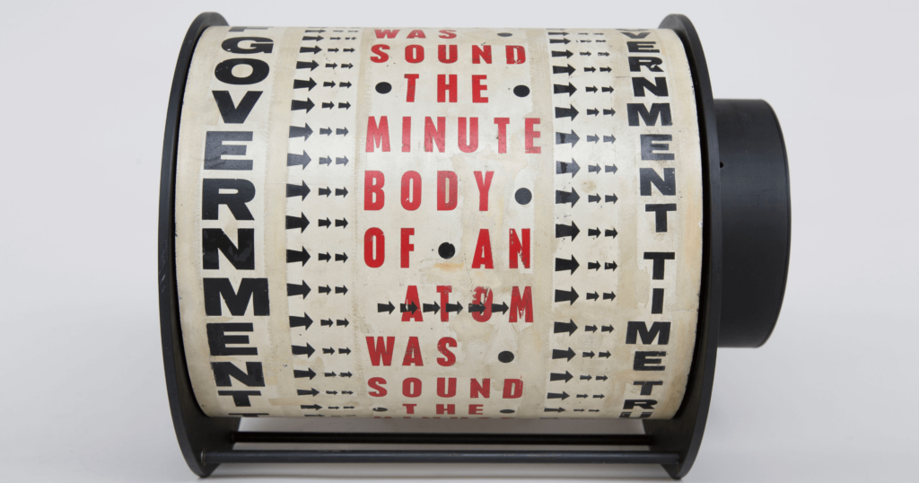 Aufgewachsen in einem vielsprachigen Umfeld, entwickelte Lijn früh ein feines Gespür für Sprache und Poesie. Und doch scheint sie dem geschriebenen Wort keine große Aufmerksamkeit zu schenken. In ihren „Poem Machines“ bringt sie Wörter in mechanische Bewegung, um sie von festen Bedeutungen zu lösen. Die Zylinder drehen sich so schnell, dass die darauf gedruckten Worte kaum lesbar sind – eine bewusste Einladung, Sprache anders wahrzunehmen. Für Lijn entstehen durch gesprochene Worte spezifische Schwingungen, die Energie freisetzen. Wie sie selbst sagt: „The main concern of my work has been and is ‘energy transfer’.”
