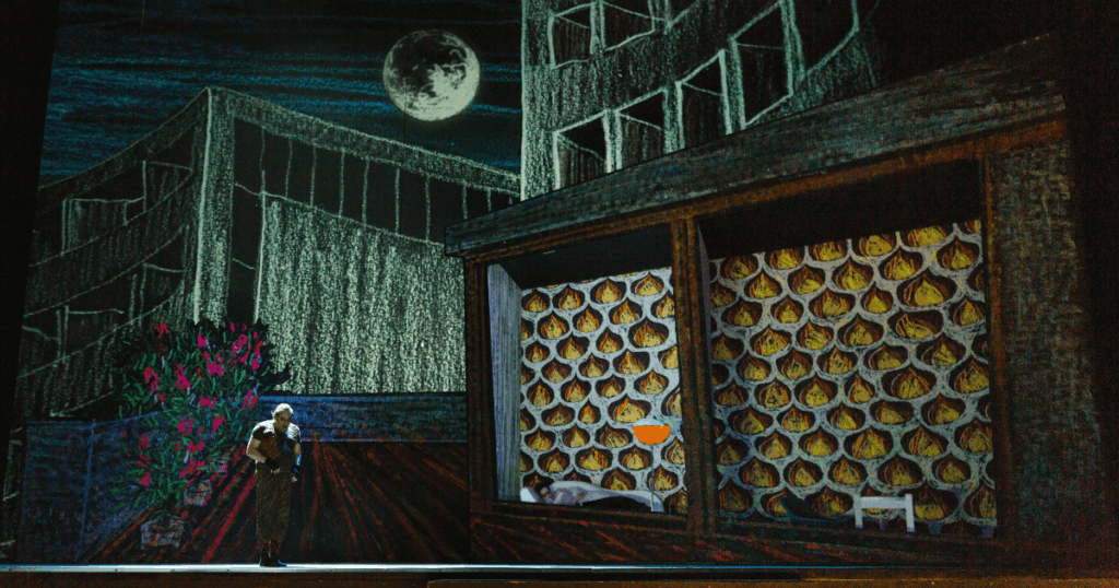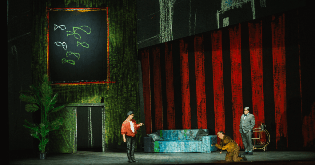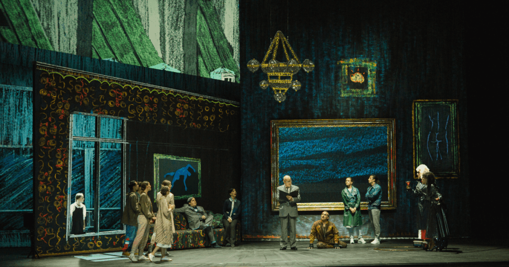 Generell verwandelt sich die ganze Bühne der Volksoper Wien in ein 3-dimensionales, illustriertes Märchenbuch. Christof Hetzer (Bühne & Kostüm) hat farbenfrohe Hintergründe geschaffen. Jeder Szenenwechsel sieht aus, als würden die Zuschauer*Innen umblättern – oder eher der Hund, der die Geschichte erzählt. Von einer Party in New York, die Wohnung von Rudolf Nurejew bis zum Ballettstudio oder der Wohnung von Marika. Es ist eine fantasievolle Umsetzung mehrerer Handlungsorte, die sich spielerisch zusammenfügen.