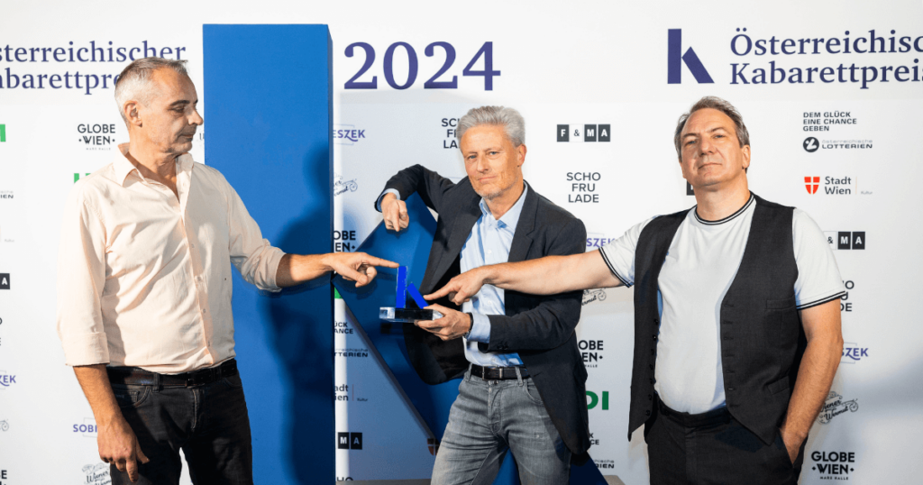 „GHÖST“, das sind neben Pikart noch Berni Wagner und Christoph Fritz, die nur vordergründig eine Halloween-Show auf die Bühne bringen. Im Grunde könnte man sie fast als die Erben jenes anderen ausgezeichneten Trios sehen, das den Sonderpreis entgegennahm: Thomas Maurer, Robert Palfrader und Florian Scheuba sind seit 2011 „Wir Staatskünstler“ – und bekamen eine ganz besondere Laudatio. Kabarettpreis-Organisatorin Julia Sobieszek hatte nämlich alle Hebel in Bewegung gesetzt und den mächtigsten Mann im Staat dafür gewonnen. Bundespräsident Alexander Van der Bellen schickte einen launigen Videogruß, in dem er zuerst feststellte: „Ich freue mich wirklich jedes Mal, wenn ihr ein neues Programm vorstellt. Bei den Parteien kann ich das nicht immer behaupten.”