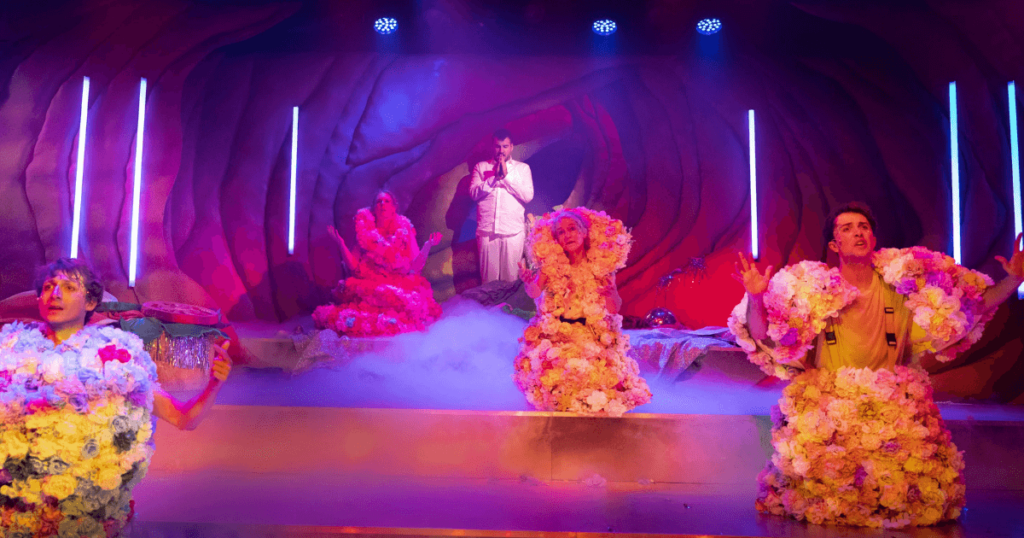 Der rote Samtvorhang ist beleuchtet, von den Seiten nähern sich Säulen, bestückt mit vielen bunten Blumen und erzählen uns etwas. Wait what?