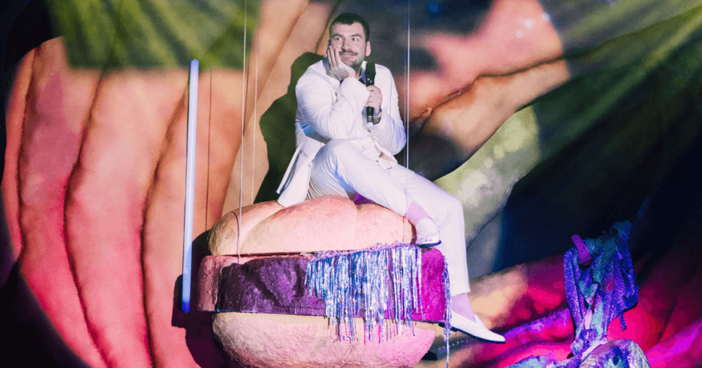 Es beginnt mit dem roten Samtvorhang (Bühnenbild: Dominique Wiesbauer) und geht weiter zu einer silber glitzernden Wand, die mit der Zeit immer tiefer hängt und immer mehr zu schleimen anfängt. Bis am Ende eine ovale Öffnung auf der Bühne erscheint. Man merkt fast zu spät, dass man buchstäblich in die Abgründe des menschlichen Hinterausgangs gekrochen ist. Passend zum Verdauungstrakt finden wir hier auch ein menschengroßes Punschkrapferl und eine riesige Leberkässemmel, aus deren innerem Glitzer herausquillt.
