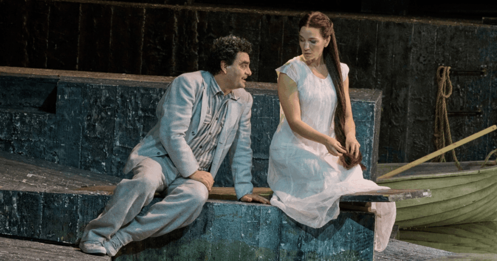 Schlicht gehalten wird, trotz der unglaublich tragischen (aber irgendwie total realen und gegenwärtigen) Handlung, das Bühnenbild. Obwohl die Bühnenelemente kaum verändert werden, ist die Bühne nie still. Das Wasser zeigt seine Unterstützung in den wilden Szenen. Sei es durch Wassertropfen, die hochspritzen, wenn Golaud Jagd auf seinen Bruder macht. Oder das sanfte Wellenspiel, das Pelléas und Mélisande in den Sonnenuntergang führt.