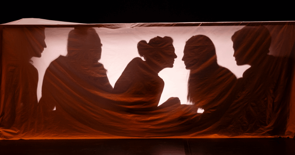 Irgendwann mündet alles in einen feministischen Streik, bei dem sich Frauen verweigern. Ob das jetzt tatsächlich passiert oder bloß Wunschdenken ist, bleibt mir unklar. Berichtet wird vom Aufstand jedenfalls unter dem Esstisch. Durch das Zusammenspiel von Licht und Schatten sieht das Publikum, wie die Fünf ihre Köpfe zusammenstecken und vom Zusammenbruch der Säulen des Patriarchats berichten. Da sind die Väter, die plötzlich ratlos vor dem Wäscheberg und dem schreienden Kind stehen und nicht wissen, wo dieser verdammte Hut sein soll, unter den das alles passt. Auch die Büros, Geschäfte und Krankenhäuser können das Tagesgeschäft ohne Frauen nicht aufrechterhalten.