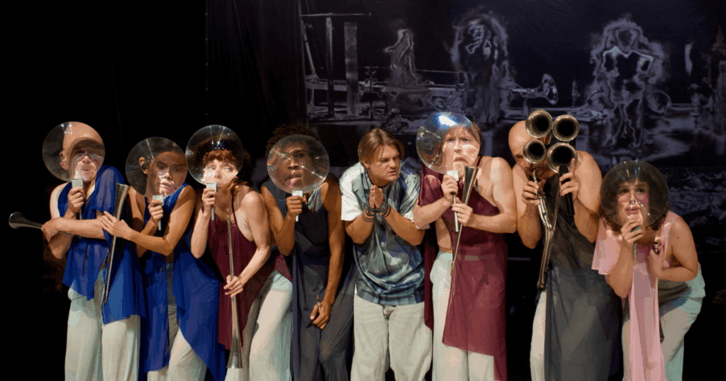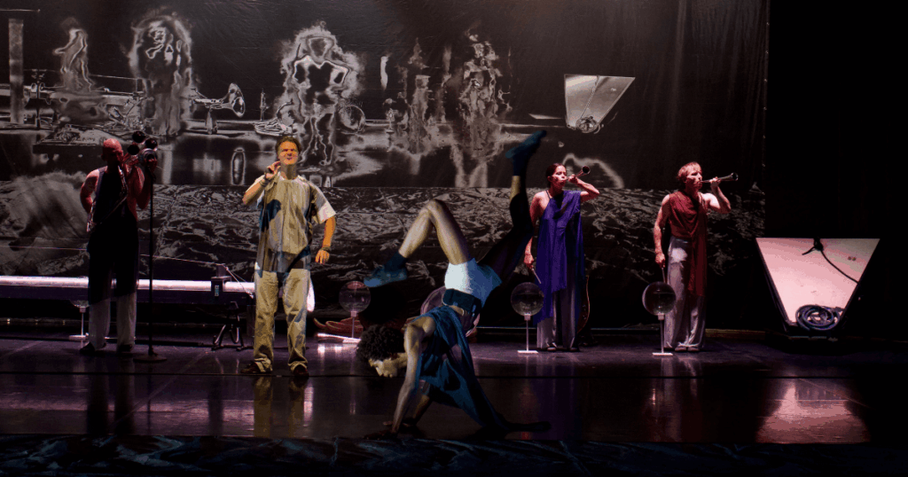 Plötzlich kommen die Figuren Orpheus und Eurydike im Schrifttext vor. Vielleicht geht es um eine Sage aus der griechischen Mythologie? Dabei verzaubert Sopranistin Lore Binon mit ihrer Stimme und ich versinke darin. Sobald ich akzeptiert habe, dass es keine klassische Storyline gibt, lasse ich mich auf das Erlebnis ein. Auf die Instrumente, die für das Stück entwickelt wurden. Auf die Tänzer:innen, die leichtfüßig über die Bühne springen, sich über den Boden rollen und sich anmutig drehen. Auf die locker fallenden und luftigen Kostüme.