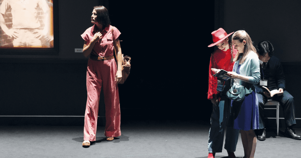 Schon während dem Saaleinlass tut sich was auf der Bühne. Es ist ein Teil eines Museums zu sehen, wo ein Strick in einer Vitrine zu sehen ist. Daneben hängt das Bild von Edward J. Leonski. Tourist*Innen gehen vorbei, schießen Selfies mit dem „feschen“ Serienmörder. Es sind fast absurde Szenen, die wir alle aus Museen wiedererkennen. Drei Frauen lesen seine Geschichte nach und durchforsten das Beweismaterial. Eine durchsichtige Leinwand, die sich über die ganze Bühne erstreckt, wird genutzt, um alle Fakten aufzuzeigen. Man liest Ausschnitte aus dem Polizeibericht und weiß sofort: Das könnte heftig werden.
