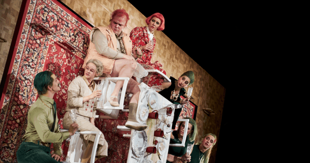 Die Bühne von Jessica Rockstroh ist gelungen. Jede Wohnung wird aus der Vogelperspektive gezeigt, alles spielt sich in der Vertikalen ab. Sofa, Bügelbrett, sowie Sessel und Kücheneinrichtung sieht man von oben. Wie ein Bild stehen die Wohnungen auf der Bühne, und die Schauspieler*innen müssen sich sportlich über die Einrichtungsgegenstände hangeln. Dadurch ist der Radius und die Bewegungsmöglichkeit der Schauspieler*innen eingeschränkt und angespannt – und genau das passt zu den festgefahrenen und schwierigen Figuren Schwabs. Dadurch kommen auch einige Gags zur Geltung, da hier natürlich mit Requisiten und überzogenen Bewegungen gespielt wird. Ein leichter Slapstick kombiniert sich mit brutalen Aussagen.